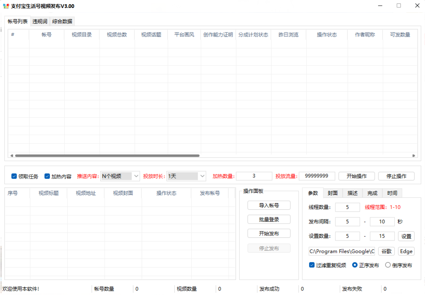 支持支付宝生活号的短视频发布,同时支持多个账号一键批量发布,大大提高了发布效率。作为一款支付宝视频批量发布工具,凭借其强大的功能和优秀的用户体验,成为了许多自媒体人的首选。